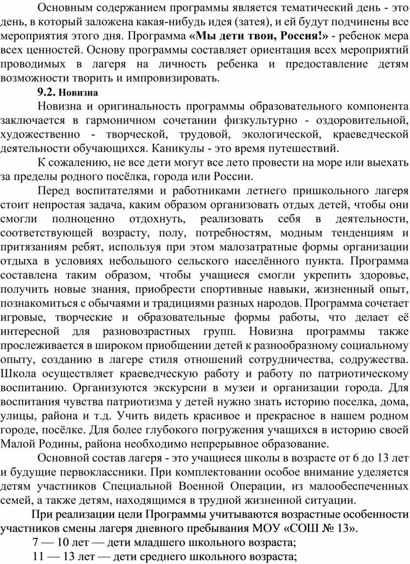 Основным содержанием программы является тематический день - это день, в который заложена какая-нибудь идея (затея), и ей будут подчинены все мероприятия этого дня. Программа «Мы дети твои, Россия!» - ребенок мера всех ценностей. Основу программы составляет ориентация всех мероприятий проводимых в лагеря на личность ребенка и предоставление детям возможности творить и импровизировать.
