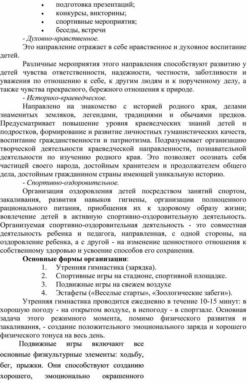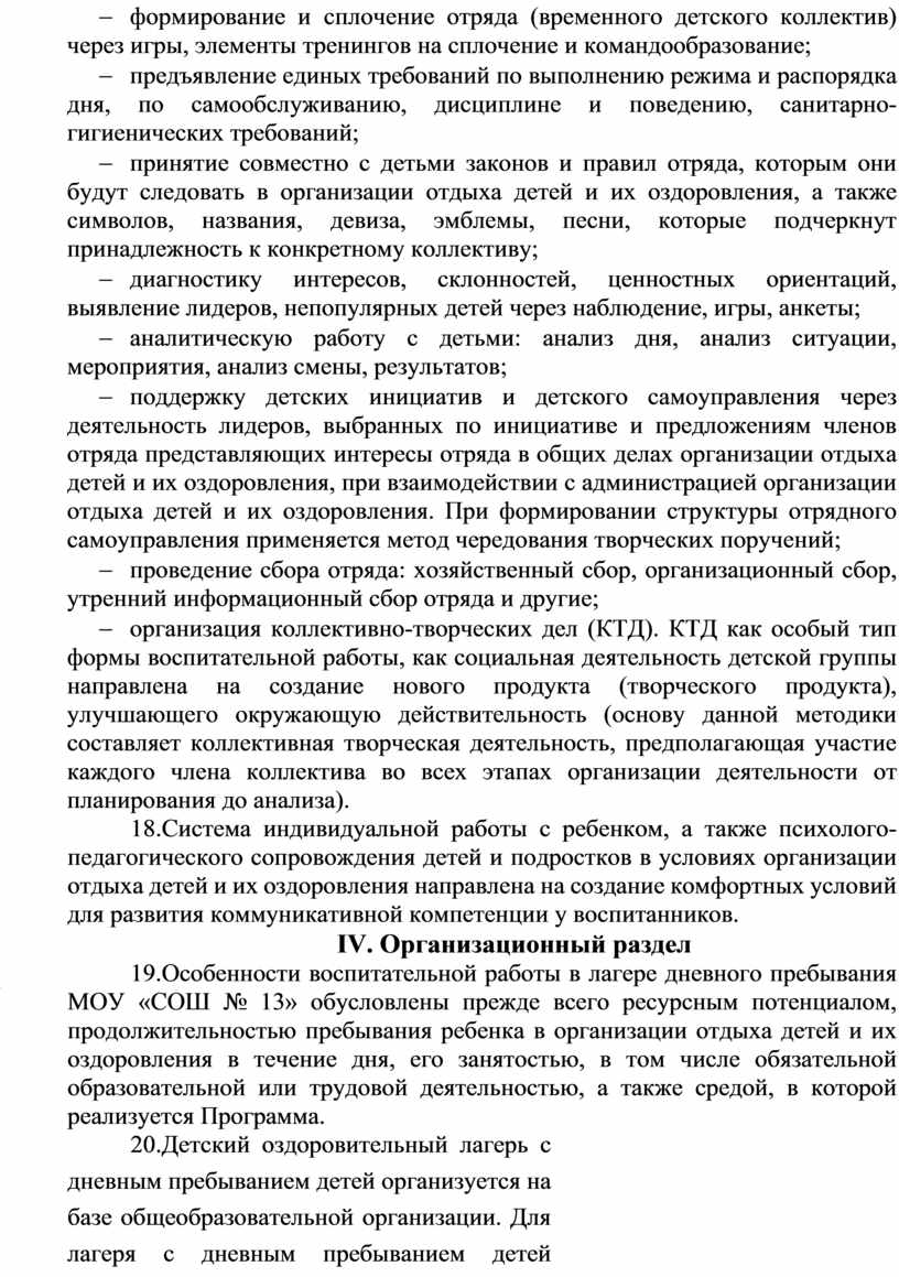За период смены в лагере с детьми проводится коллективная и индивидуальная, оздоровительная и воспитательная работы, направленные на укрепление физического, психического и нравственного здоровья школьников.