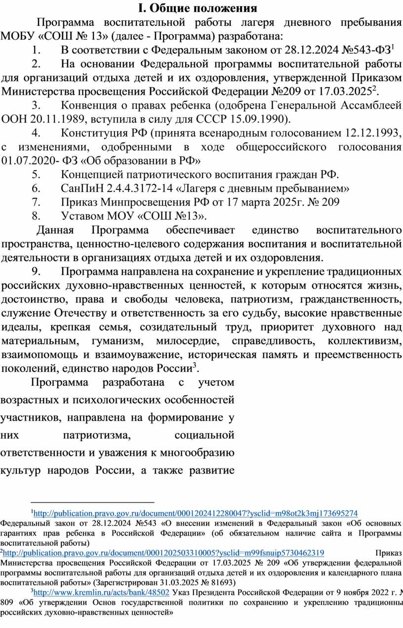 2. На основании Федеральной программы воспитательной работы для организаций отдыха детей и их оздоровления, утвержденной Приказом Министерства просвещения Российской Федерации №209 от 17.03.2025[2].