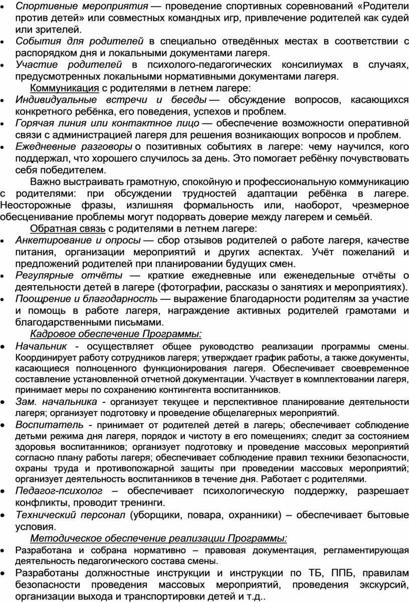 · Родительские собрания — регулярные собрания для обсуждения программы лагеря, обмена мнениями и планирования совместных мероприятий. Участие специалистов (психологов, педагогов) для обсуждения актуальных вопросов.