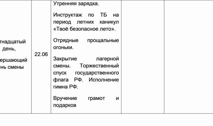 Утренняя зарядка. Инструктаж по ТБ на период летних каникул «Твоё безопасное лето». Отрядные прощальные огоньки. Закрытие лагерной смены. Торжественный спуск государственного флага РФ. Исполнение гимна РФ. Вручение грамот и подарков |
