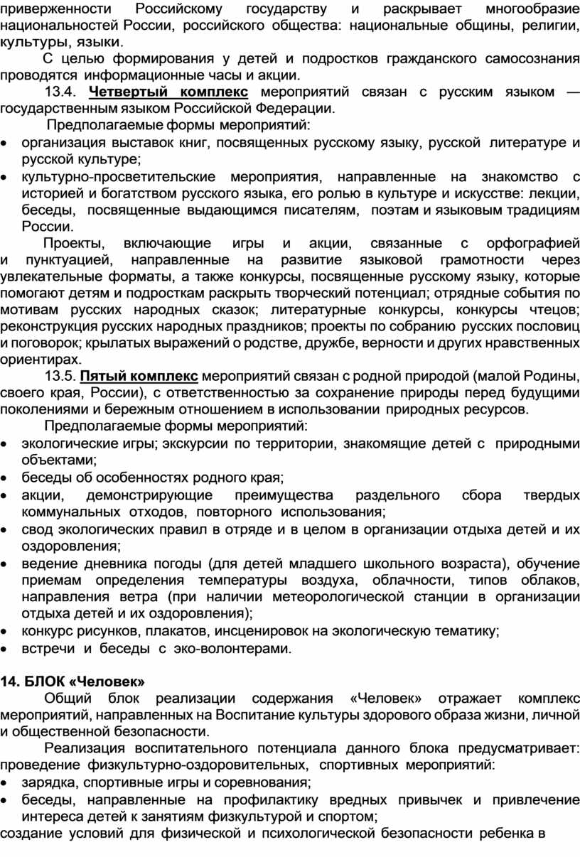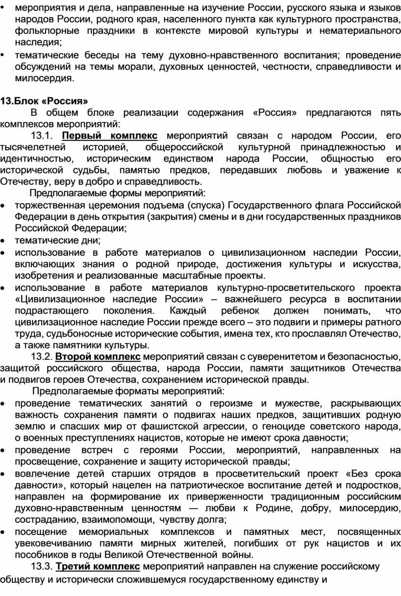 13.1. Первый комплекс мероприятий связан с народом России, его тысячелетней историей, общероссийской культурной принадлежностью и идентичностью, историческим единством народа России, общностью его исторической судьбы, памятью предков, передавших любовь и уважение к Отечеству, веру в добро и справедливость.
