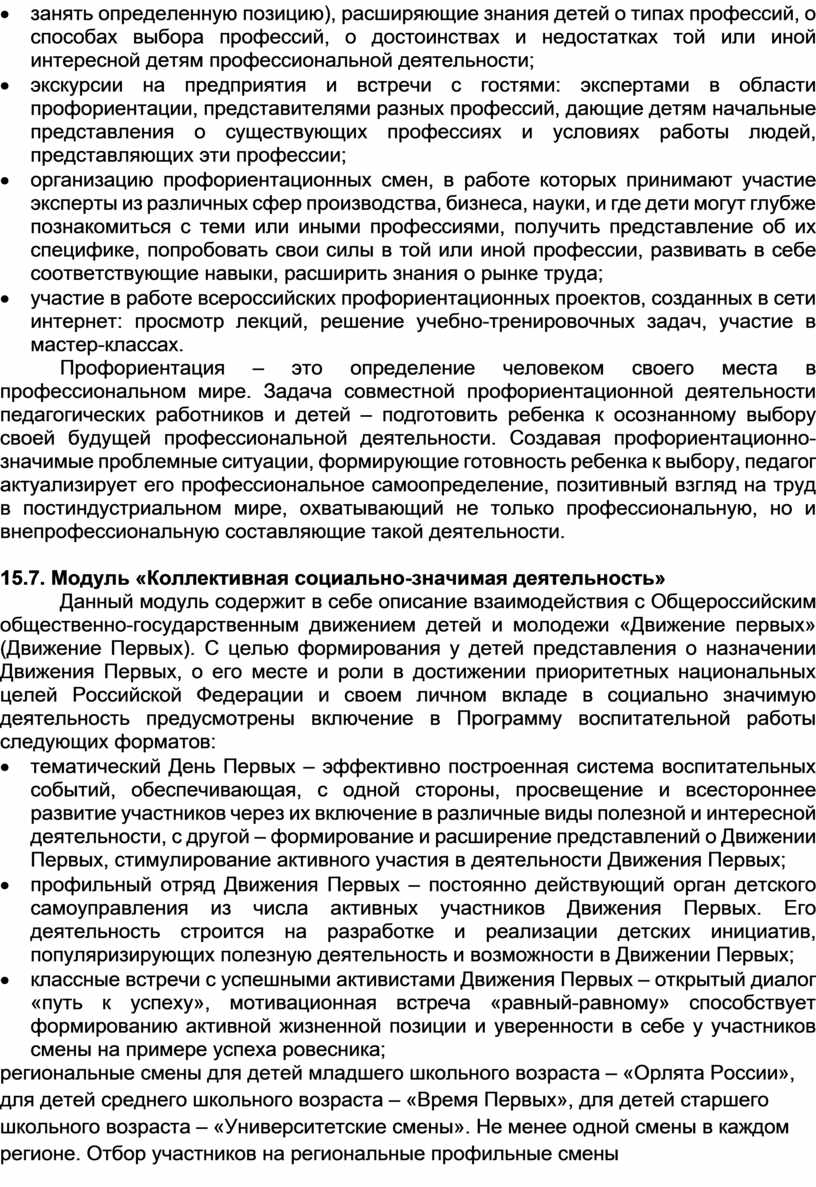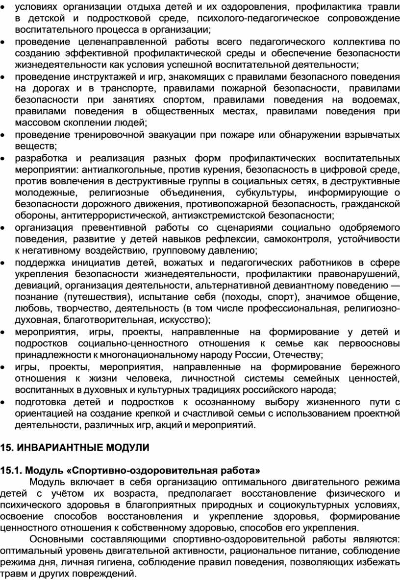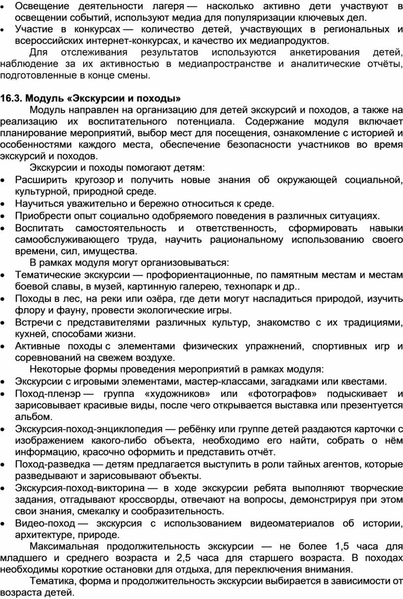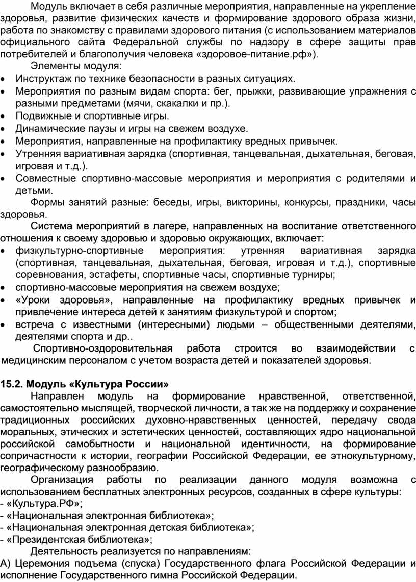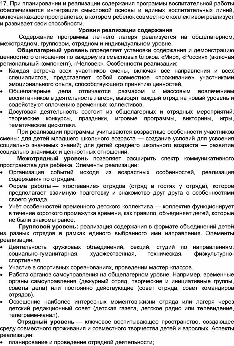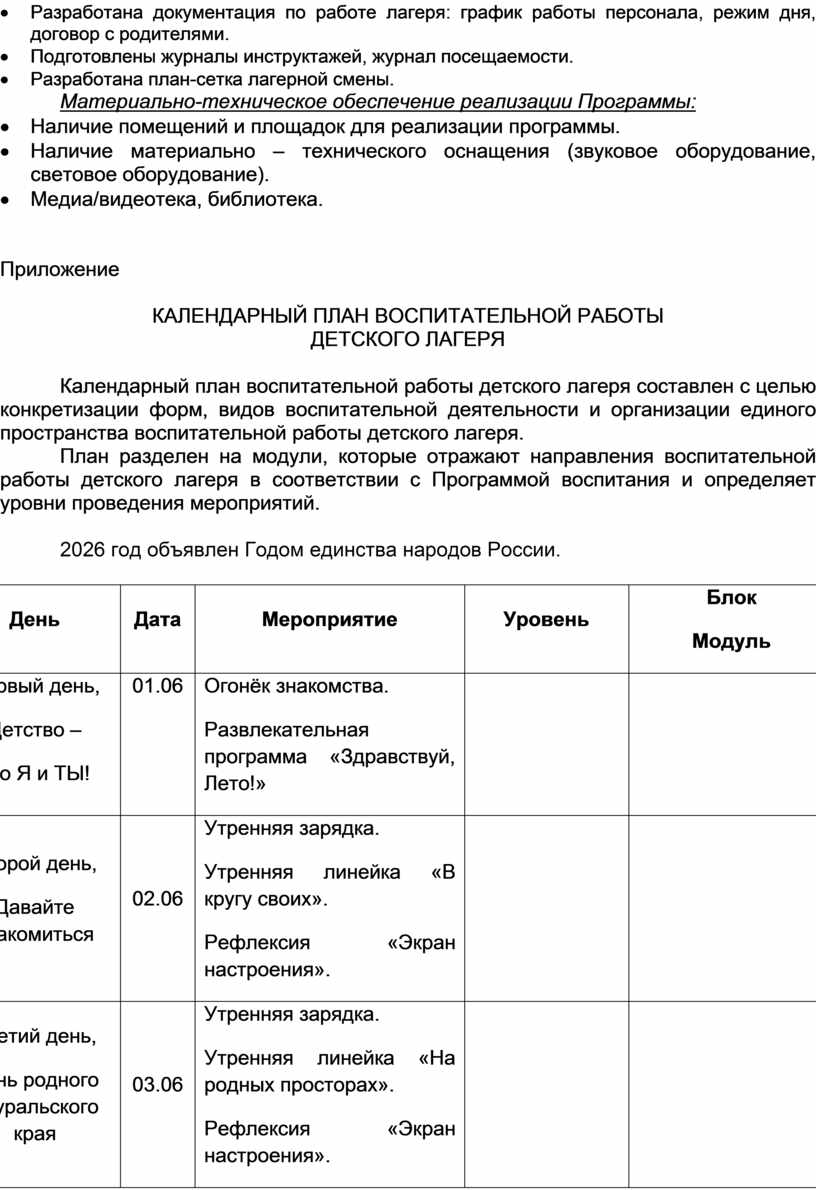 План разделен на модули, которые отражают направления воспитательной работы детского лагеря в соответствии с Программой воспитания и определяет уровни проведения мероприятий.