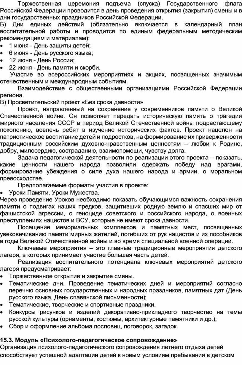 · торжественная церемония подъема (спуска) Государственного флага Российской Федерации в день открытия (закрытия) смены и в дни государственных праздников Российской Федерации;