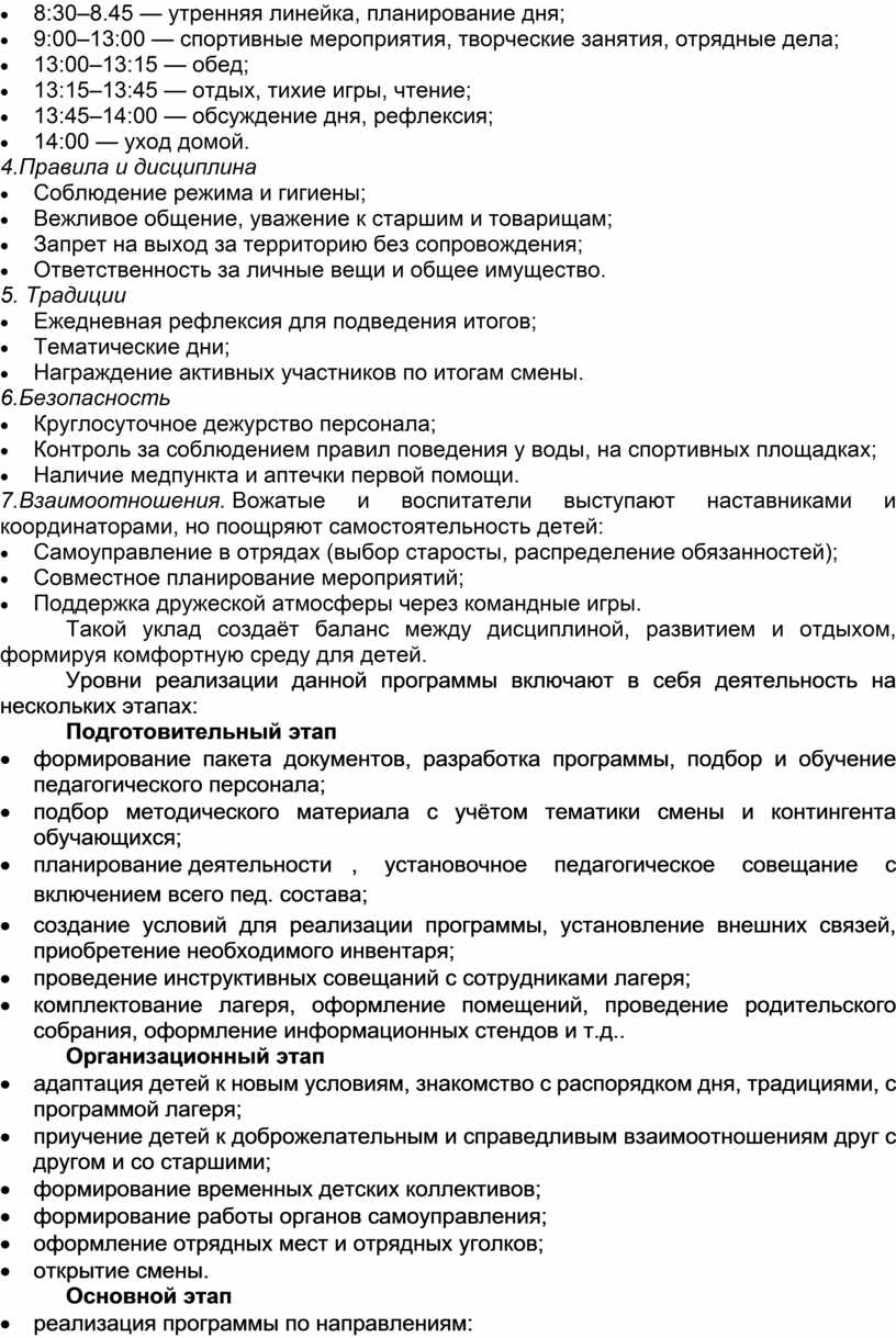 · Предварительное собрание перед началом смены. Представление программы лагеря, расписания, правил и мероприятий, знакомство с вожатыми и воспитателями, обсуждение вопросов безопасности, питания, медицинского обслуживания и других важных аспектов.