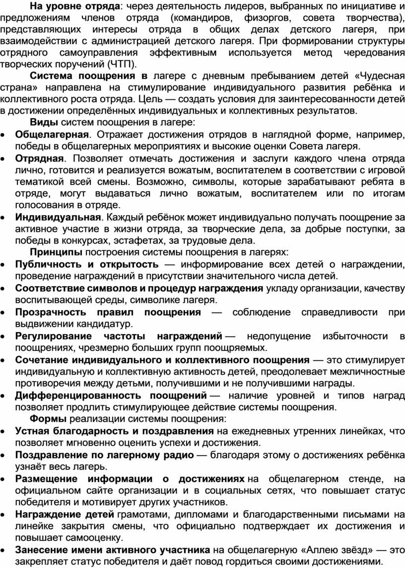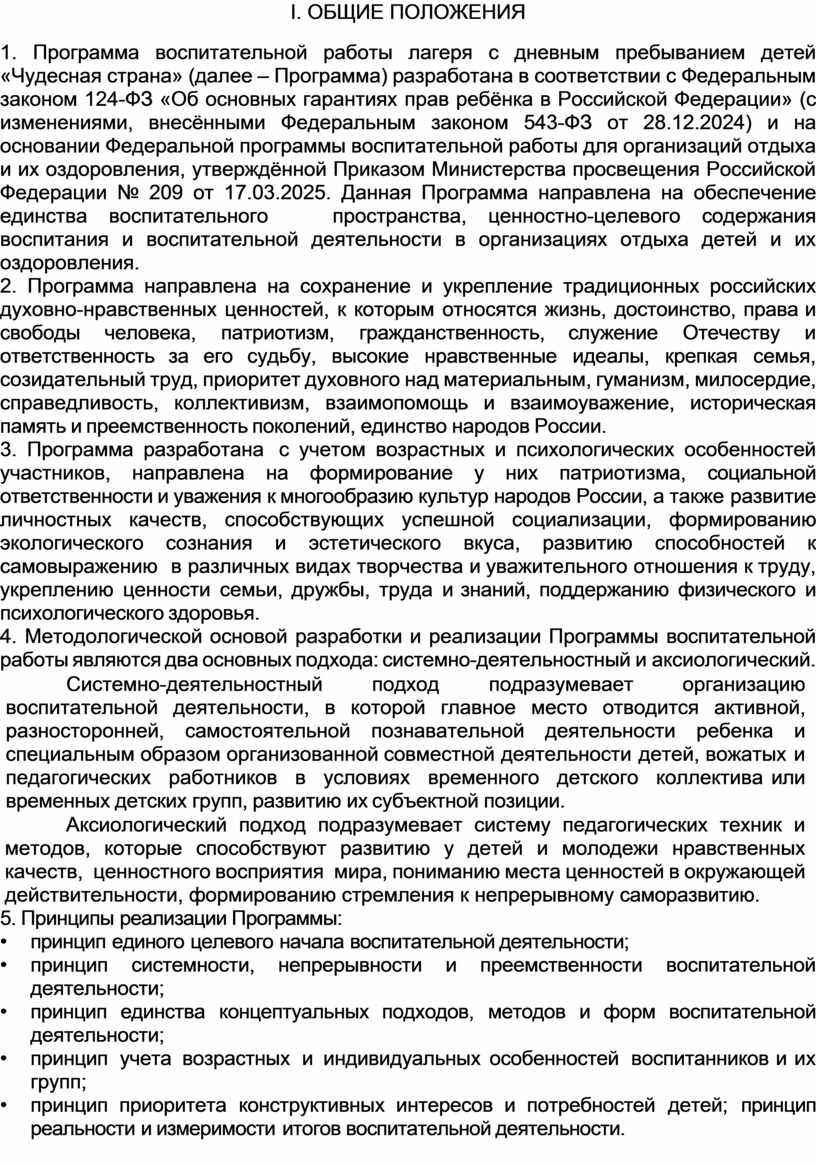 1. Программа воспитательной работы лагеря с дневным пребыванием детей «Чудесная страна» (далее – Программа) разработана в соответствии с Федеральным законом 124-ФЗ «Об основных гарантиях прав ребёнка в Российской Федерации» (с изменениями, внесёнными Федеральным законом 543-ФЗ от 28.12.2024) и на основании Федеральной программы воспитательной работы для организаций отдыха и их оздоровления, утверждённой Приказом Министерства просвещения Российской Федерации № 209 от 17.03.2025. Данная Программа направлена на обеспечение единства воспитательного пространства, ценностно-целевого содержания воспитания и воспитательной деятельности в организациях отдыха детей и их оздоровления.
