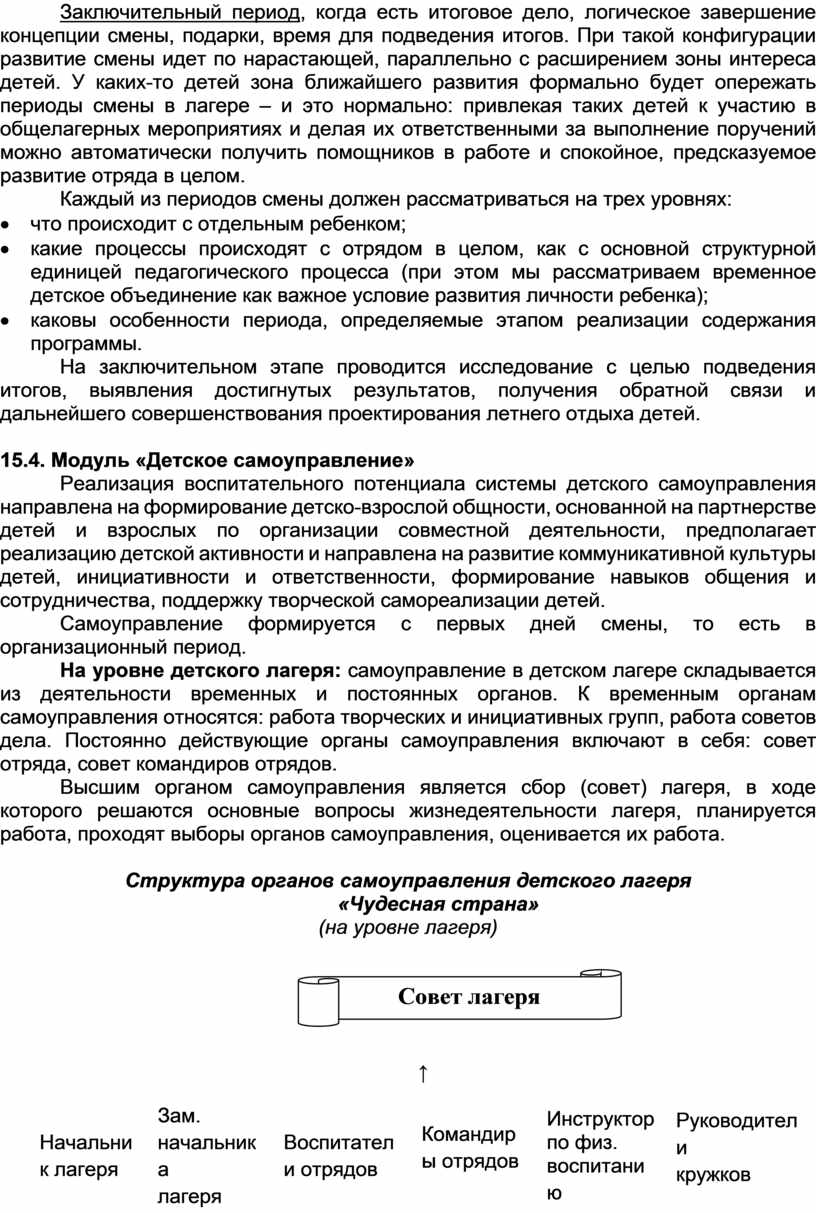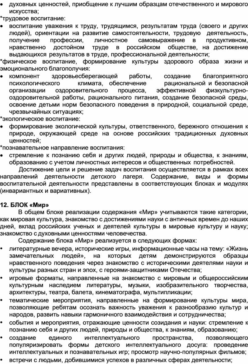 10.Разделы Программы раскрывают особенности формирования содержания воспитательной работы, а блоки «Мир», «Россия», «Человек» определяют ключевые сквозные векторы содержания инвариантных и вариативных модулей лагеря с дневным пребыванием детей «Чудесная страна».