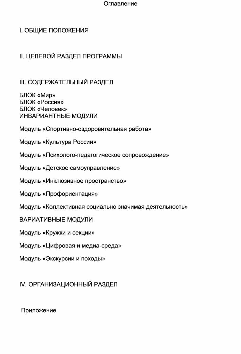 III. СОДЕРЖАТЕЛЬНЫЙ РАЗДЕЛ БЛОК «Мир» БЛОК «Россия» БЛОК «Человек» ИНВАРИАНТНЫЕ МОДУЛИ Модуль «Спортивно-оздоровительная работа» Модуль «Культура России» Модуль «Психолого-педагогическое сопровождение» Модуль «Детское самоуправление» Модуль «Инклюзивное пространство» Модуль «Профориентация» Модуль «Коллективная социально значимая деятельность» ВАРИАТИВНЫЕ МОДУЛИ Модуль «Кружки и секции» Модуль «Цифровая и медиа-среда» Модуль «Экскурсии и походы»