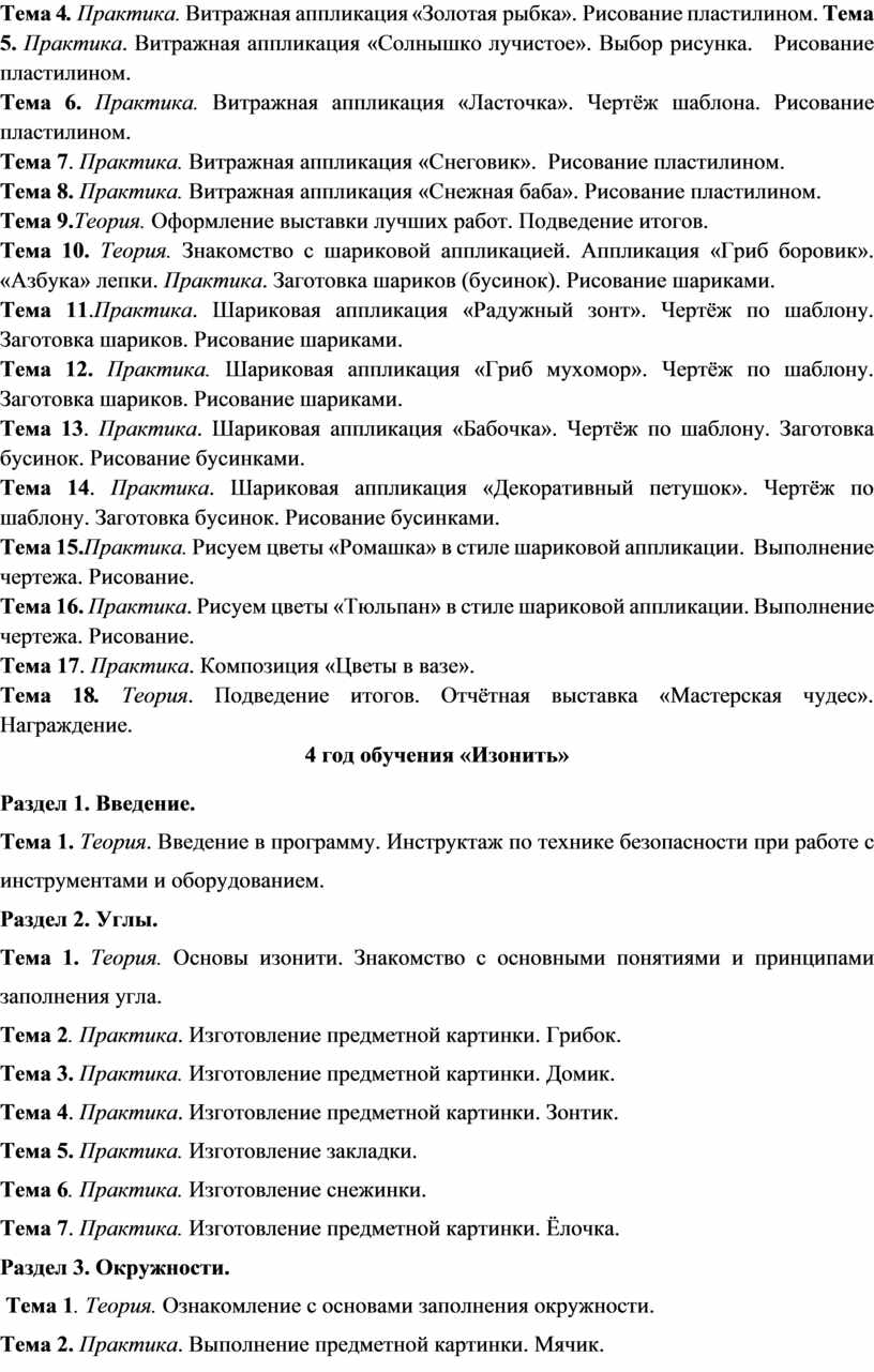 Четвёртый год обучения посвящён искусству изонить (рисование нитью). Изонить – техника, напоминающая вышивание. Она заключается в создании образа путём пересечения цветных нитей на картоне. Работа в технике изонить способствует развитию мелкой моторики рук, воспитанию терпения, формированию творческих способностей и образного мышления. Образовательная программа «Изонить» направлена на эффективную форму приобщения детей к дакоративно - прикладному искусству. Творческое развитие обучающихся осуществляется через знакомство с изделиями декоративно – прикладного направления.