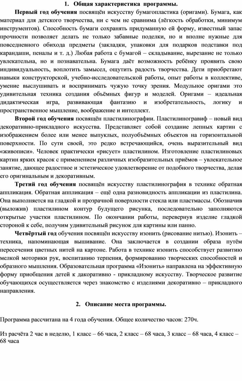 Программа рассчитана на 4 года обучения. Общее количество часов: 270ч.