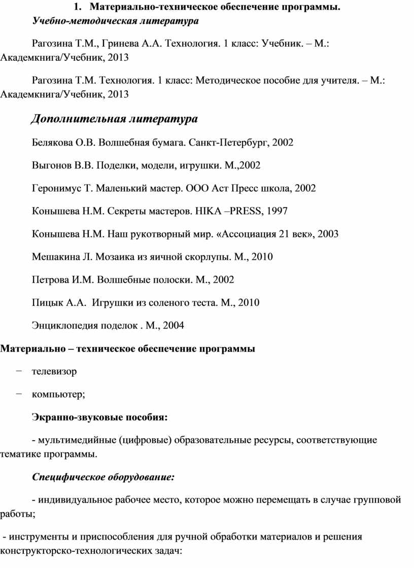 Рагозина Т.М., Гринева А.А. Технология. 1 класс: Учебник. – М.: Академкнига/Учебник, 2013