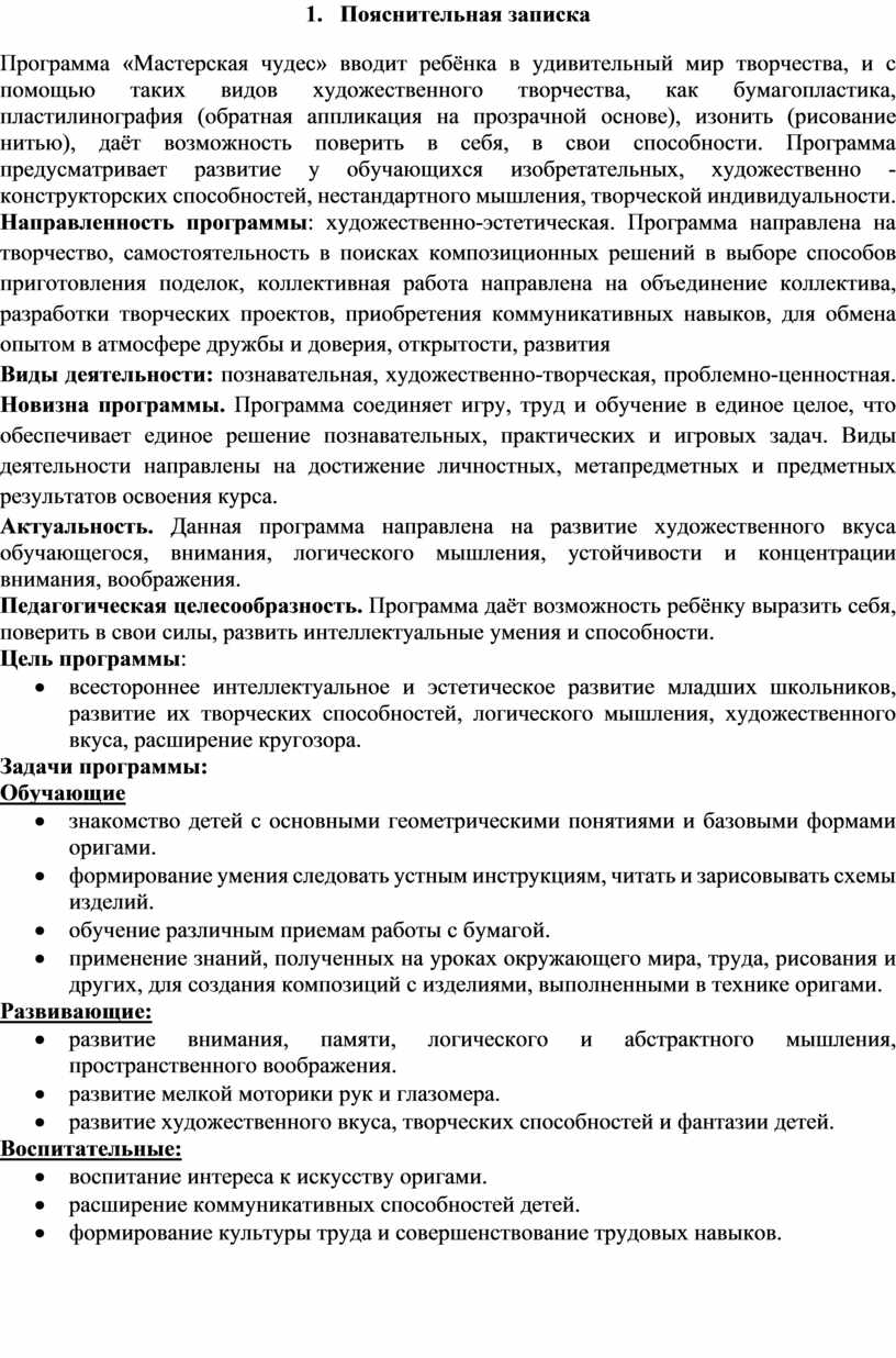 Программа «Мастерская чудес» вводит ребёнка в удивительный мир творчества, и с помощью таких видов художественного творчества, как бумагопластика, пластилинография (обратная аппликация на прозрачной основе), изонить (рисование нитью), даёт возможность поверить в себя, в свои способности. Программа предусматривает развитие у обучающихся изобретательных, художественно - конструкторских способностей, нестандартного мышления, творческой индивидуальности.