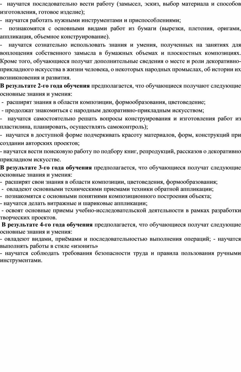 - научатся сознательно использовать знания и умения, полученных на занятиях для воплощения собственного замысла в бумажных объемах и плоскостных композициях. Кроме того, обучающиеся получат дополнительные сведения о месте и роли декоративно-прикладного искусства в жизни человека, о некоторых народных промыслах, об истории их возникновения и развития.