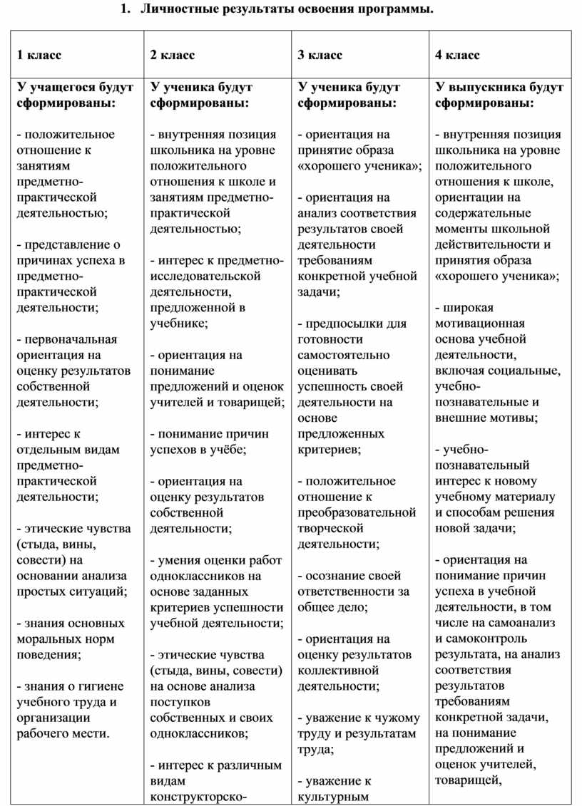 У ученика будут сформированы: - внутренняя позиция школьника на уровне положительного отношения к школе и занятиям предметно-практической деятельностью; - интерес к предметно-исследовательской деятельности, предложенной в учебнике; - ориентация на понимание предложений и оценок учителей и товарищей; - понимание причин успехов в учёбе; - ориентация на оценку результатов собственной деятельности; - умения оценки работ одноклассников на основе заданных критериев успешности учебной деятельности; - этические чувства (стыда, вины, совести) на основе анализа поступков собственных и своих одноклассников; - интерес к различным видам конструкторско-технологической деятельности. |