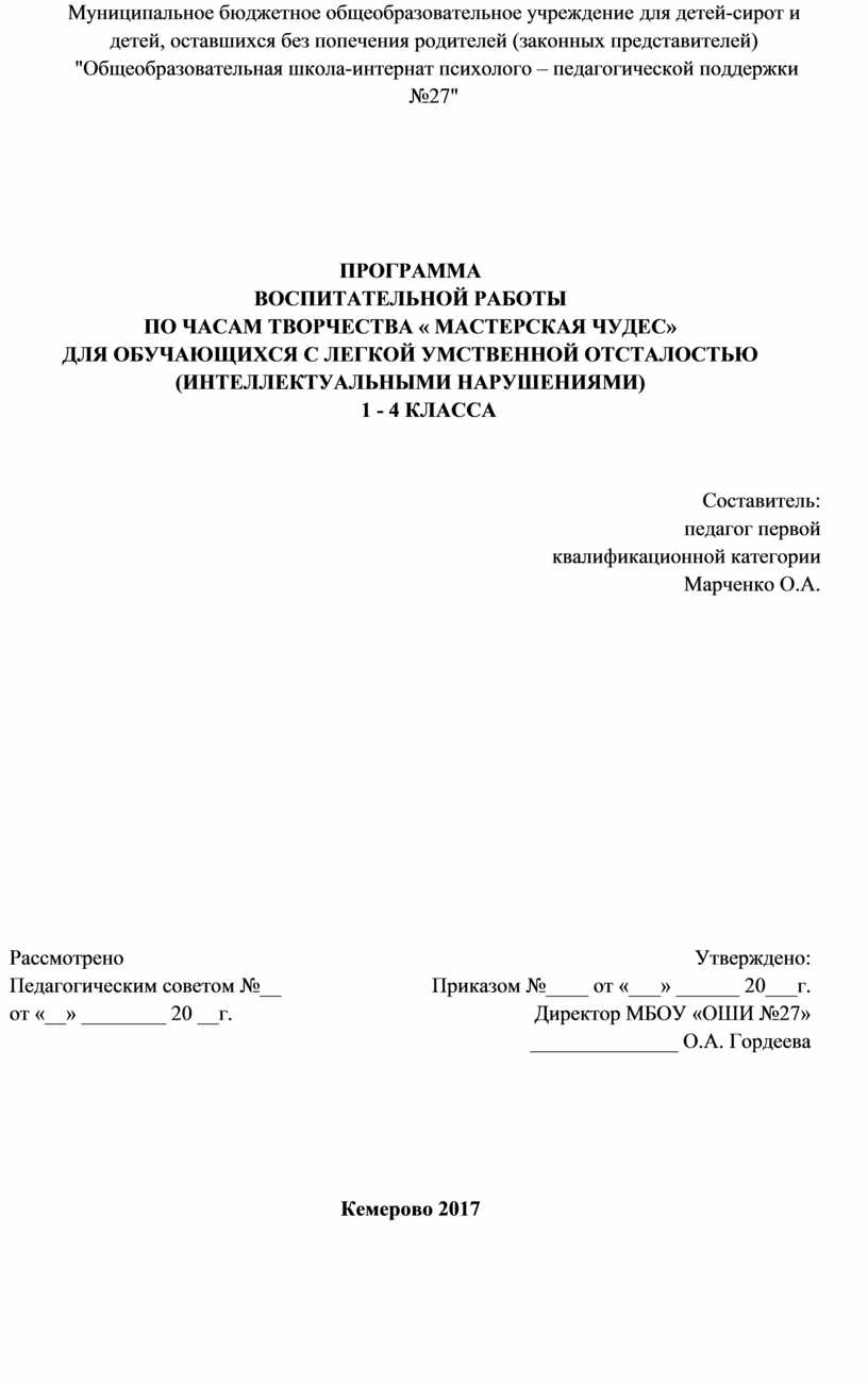 Утверждено: Приказом №____ от «___» ______ 20___г. Директор МБОУ «ОШИ №27» ______________ О.А. Гордеева |