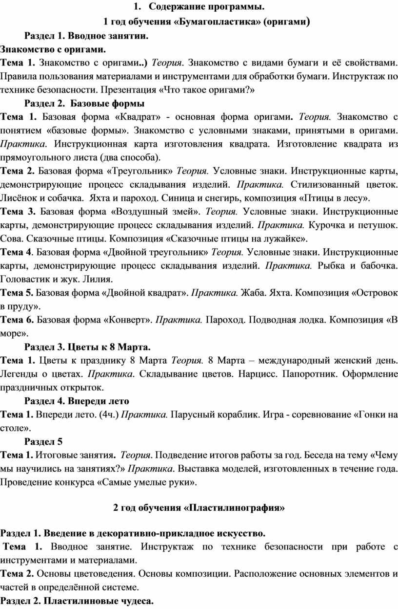 Первый год обучения посвящён искусству бумагопластика (оригами). Бумага, как материал для детского творчества, ни с чем не сравнима (лёгкость обработки, минимум инструментов). Способность бумаги сохранять придуманную ей форму, известный запас прочности позволяет делать не только забавные поделки, но и вполне нужные для повседневного обихода предметы (закладки, упаковки для подарков подставки под карандаши, пеналы и т. д.) Любая работа с бумагой – складывание, вырезание не только увлекательна, но и познавательна. Бумага даёт возможность ребёнку проявить свою индивидуальность, воплотить замысел, ощутить радость творчества. Дети приобретают навыки конструкторской, учебно-исследовательской работы, опыт работы в коллективе, умение выслушивать и воспринимать чужую точку зрения. Модульное оригами это удивительная техника создания объёмных фигур и моделей. Оригами – идеальная дидактическая игра, развивающая фантазию и изобретательность, логику и пространственное мышление, воображение и интеллект.