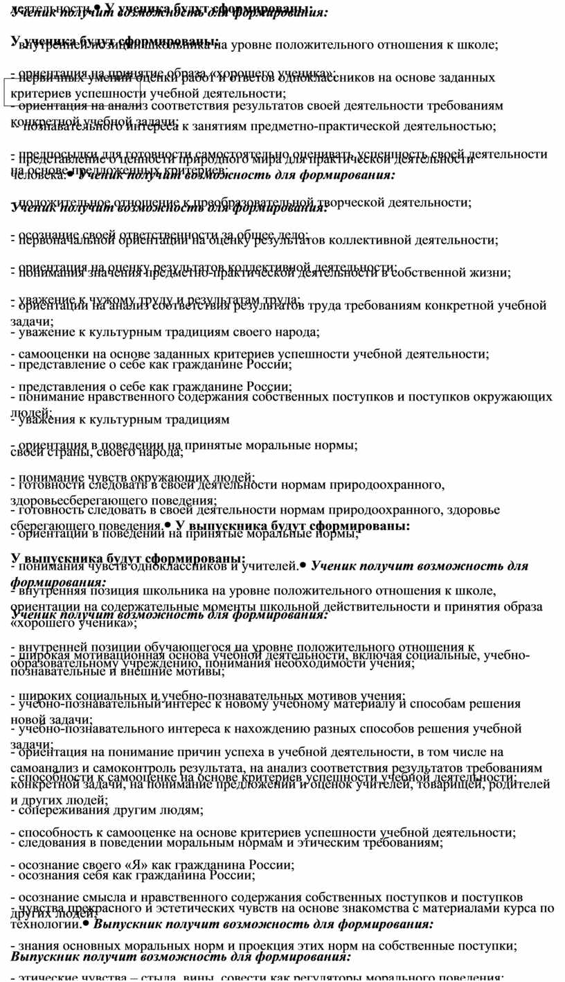 Ученик получит возможность для формирования: ‐ первоначальной ориентации на оценку результатов коллективной деятельности; ‐ понимания значения предметно-практической деятельности в собственной жизни; ‐ ориентации на анализ соответствия результатов труда требованиям конкретной учебной задачи; ‐ самооценки на основе заданных критериев успешности учебной деятельности; ‐ представления о себе как гражданине России; ‐ уважения к культурным традициям своей страны, своего народа; ‐ готовности следовать в своей деятельности нормам природоохранного, здоровьесберегающего поведения; ‐ ориентации в поведении на принятые моральные нормы; ‐ понимания чувств одноклассников и учителей. |