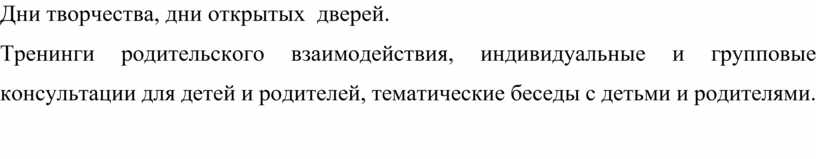 1. Ceмeйнaя гocтинaя «Тeплo рoднoгo oчaгa». 2. Кoнcультaции пcиxoлoгa пo зaпрocaм рoдитeлeй. |