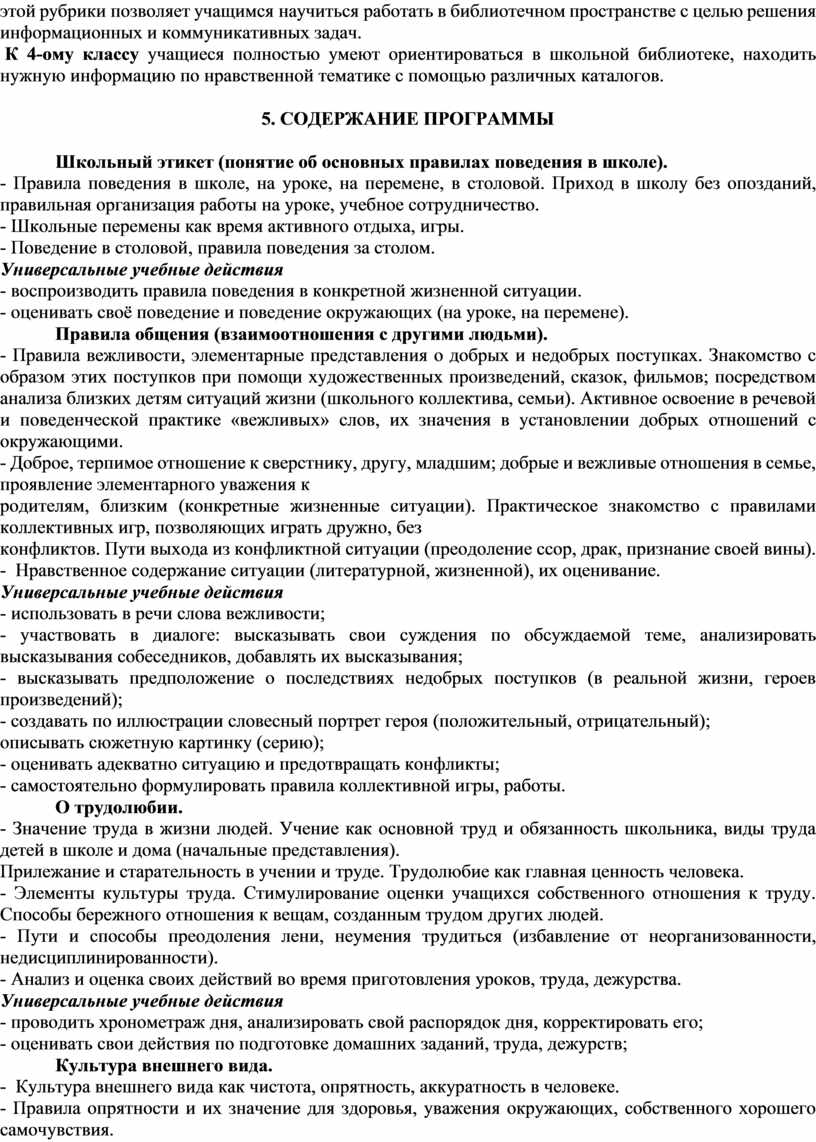 Содержание программы раскрывает правила нравственного поведения и тот внутренний механизм, который определяет их сущность (потребность выполнять правила на основе понимания их необходимости; мотивация поведения, поступка, т.е. желание, стремление делать людям добро и не причинять зла, неудобства, неприятности). Развитие нравственного сознания младшего школьника идёт от класса к классу в следующей логике: