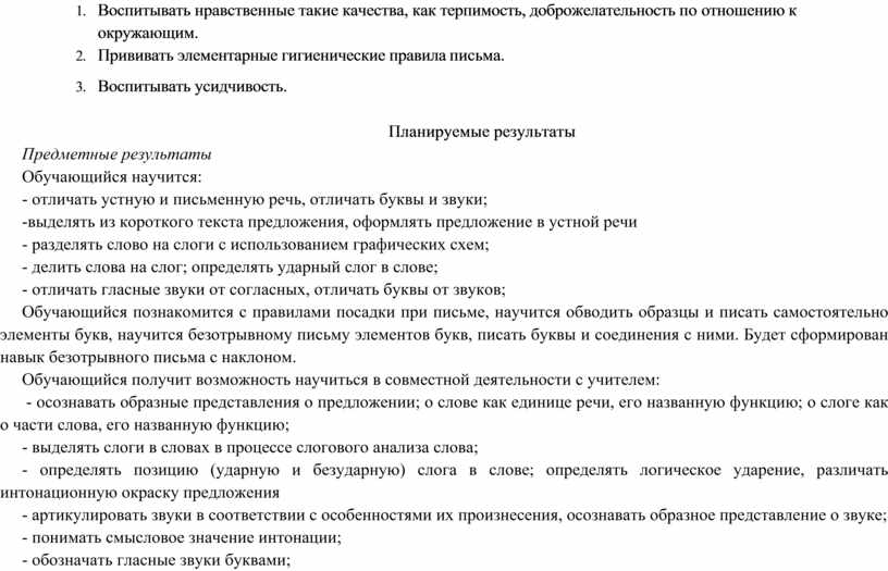 Осознание речи, ее произвольности формируется у обучающихся посредством усвоения понятий «слово», «звук», «слог», «буква», «предложение». Особое внимание в программе уделено практическому овладению каждым ребенком языковой действительности, что будет способствовать лучшему усвоению фонетики и морфологии, а также добуквенному периоду обучения, развитию звукобуквенного анализа, графических навыков, с целью подготовки руки ребенка к письму и развитию моторики (гимнастика для пальцев и кистей рук).