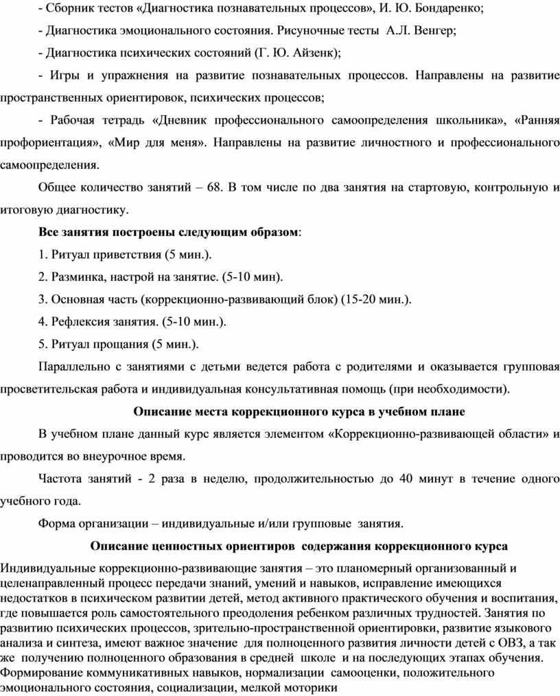 Программа включает упражнения, игры, практические занятия, ориентированные на коррекцию когнитивной, регуляторной и эмоционально-личностной сфер, коммуникативных навыков, расширению социальных контактов, повышение учебной мотивации, профессионального самоопределения.