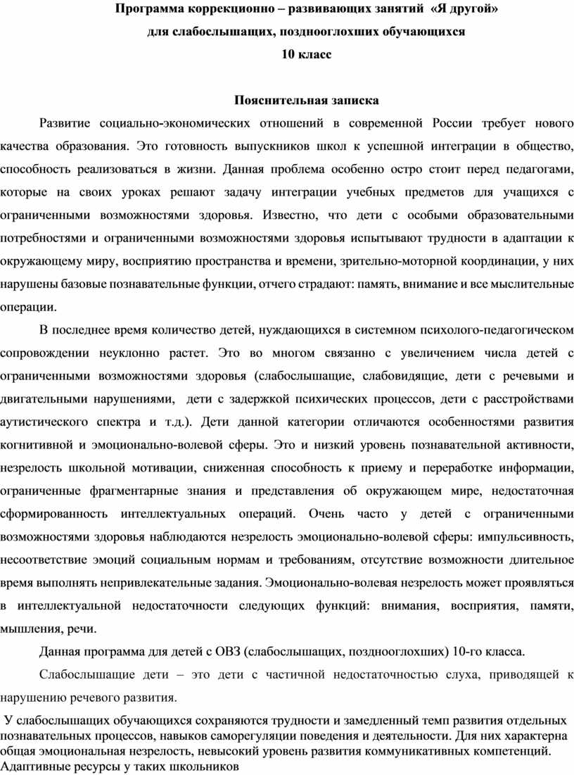 Программа коррекционно-развивающего курса «Я - Другой!» предназначена для слабослышащих, позднооглохших детей 10-х классов. Предметом коррекции являются различные задачи развития: интеллектуального, эмоционального, социального и профессионального характера.