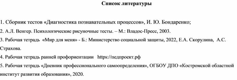 1. Сборник тестов «Диагностика познавательных процессов», И. Ю. Бондаренко;