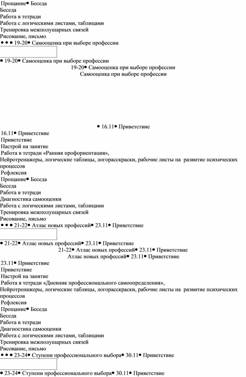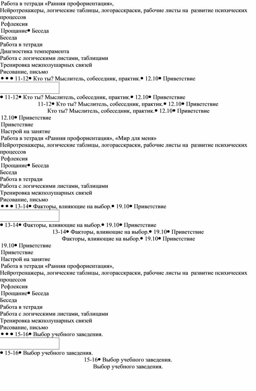 Приветствие Настрой на занятие Работа в тетради «Дневник профессионального самоопределения», Нейротренажеры, логические таблицы, логорасскраски, рабочие листы на развитие психических процессов Рефлексия Прощание |