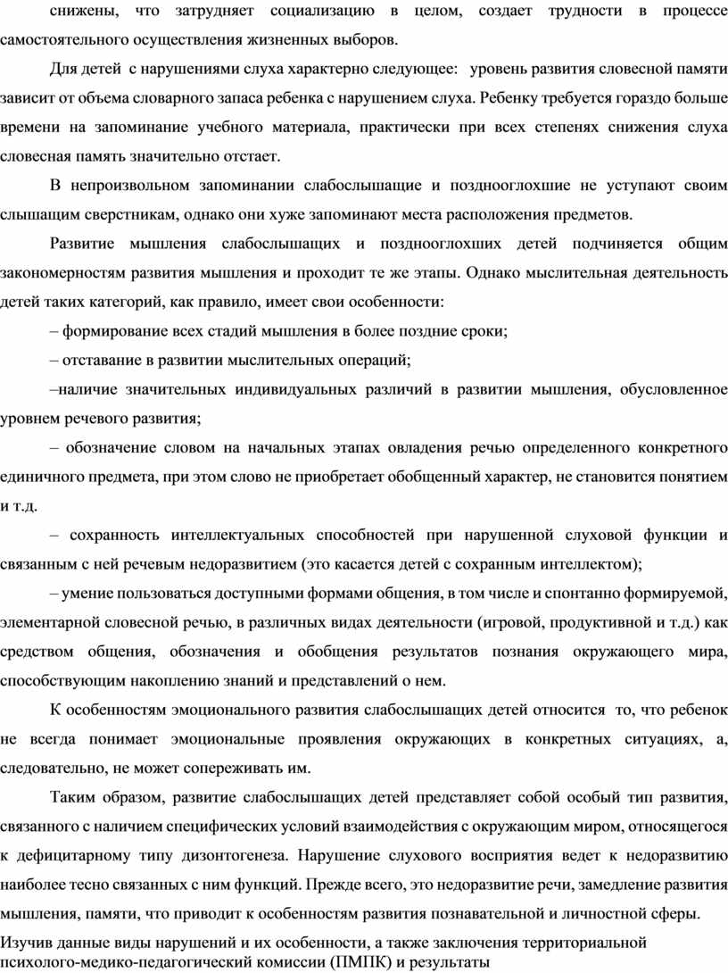 Таким образом, развитие слабослышащих детей представляет собой особый тип развития, связанного с наличием специфических условий взаимодействия с окружающим миром, относящегося к дефицитарному типу дизонтогенеза. Нарушение слухового восприятия ведет к недоразвитию наиболее тесно связанных с ним функций. Прежде всего, это недоразвитие речи, замедление развития мышления, памяти, что приводит к особенностям развития познавательной и личностной сферы.