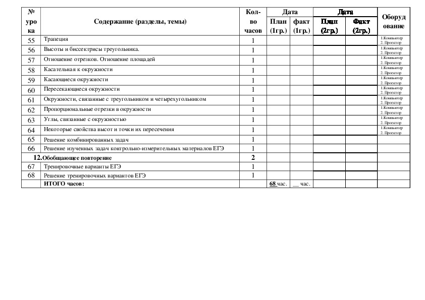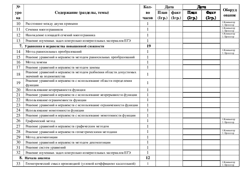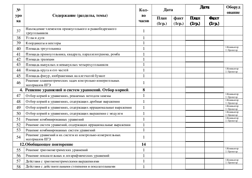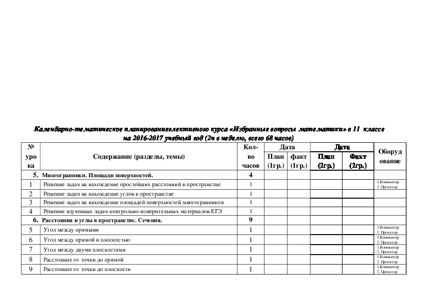 2. ПроекторКалендарнотематическое планированиеэлективного курса «Избранные вопросы математики» в 11 классе