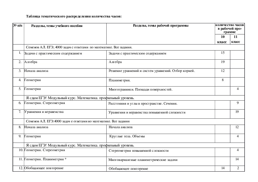 четко, лаконично, аргументировано изложить решение задачи как устно, так и письменно.Таблица тематического распределения количества часов: