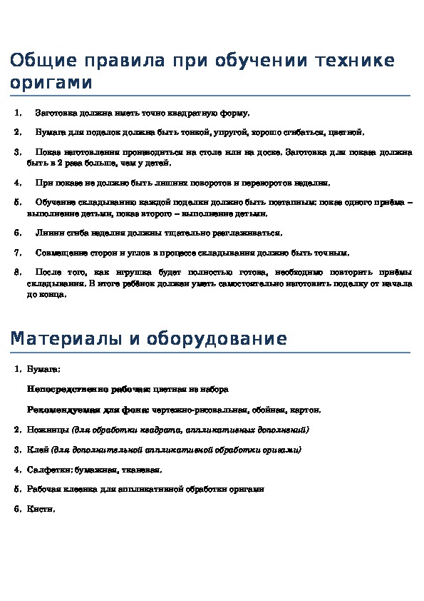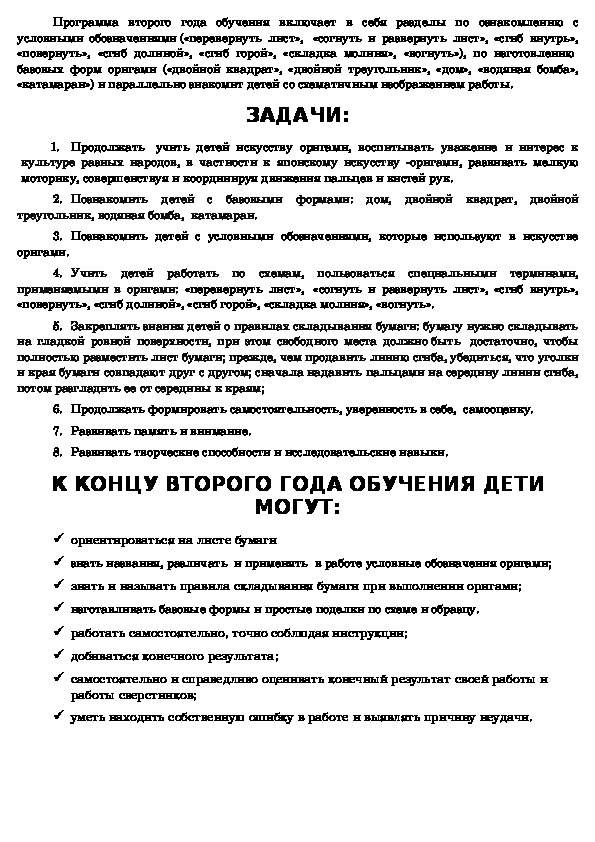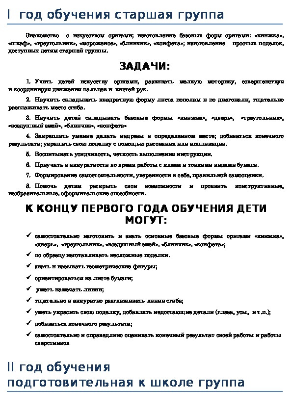 В материале предоставлена программа кружка по оригами для детей старшей и подготовительной к школе группы. Поставлены цели и определены задачи. Разработан план работы кружка на два года. Предложена диагностика.Определены темы занятий. Материал будет полезен воспитателям, педагогам подополнительного образования, гувернерам, родителям.