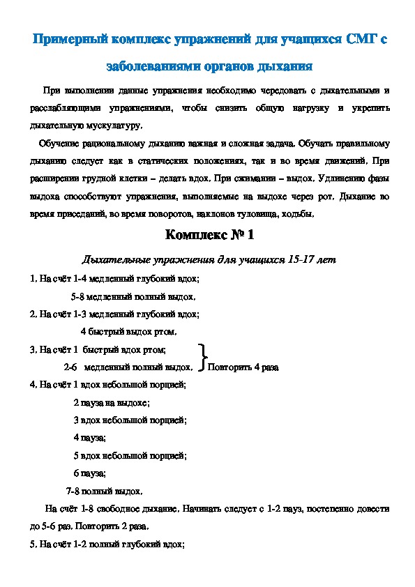 12. Примерные комплексы упражнений для учащихся СМГ с заболеваниями органов