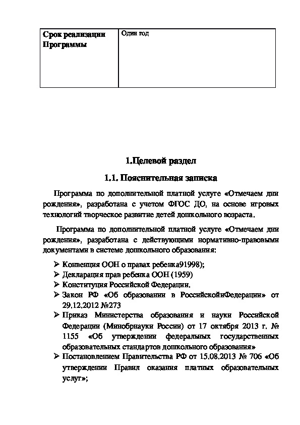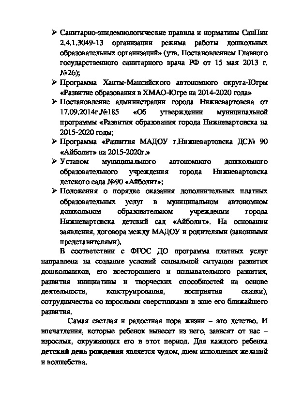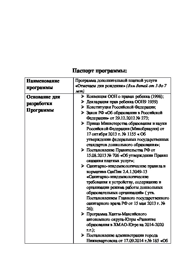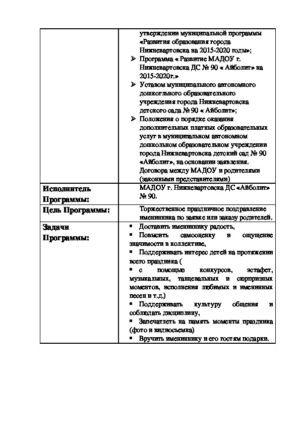 Программа по дополнительной платной услуге «Отмечаем дни рождения», разработана с действующими нормативно-правовыми документами в системе дошкольного образования:Программа учитывает образовательные потребности и интересы воспитанников группы, членов их семей и педагогов, и ориентирована на сложившиеся традиции группы.