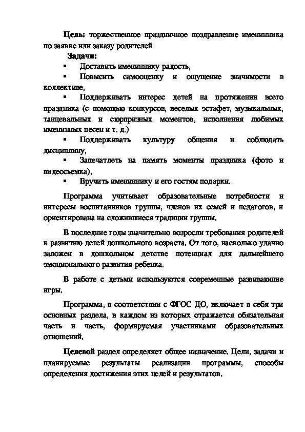 Программа по дополнительной платной услуге «Отмечаем дни рождения», разработана с учетом ФГОС ДО, на основе игровых технологий творческое развитие детей дошкольного возраста.