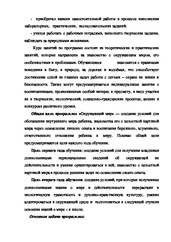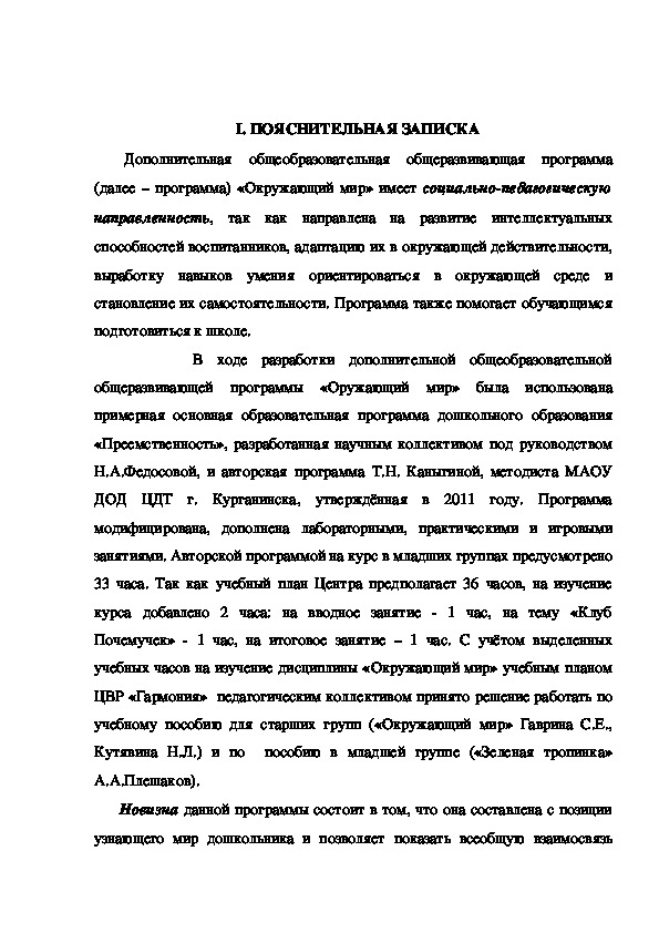 Программа составлена с позиции узнающего мир дошкольника и позволяет показать всеобщую взаимосвязь ребёнка со всей окружающей его действительностью, направлена на развитие интеллектуальных способностей воспитанников, адаптацию их в окружающей действительности, выработку навыков умения ориентироваться в окружающей среде и становление их самостоятельности.