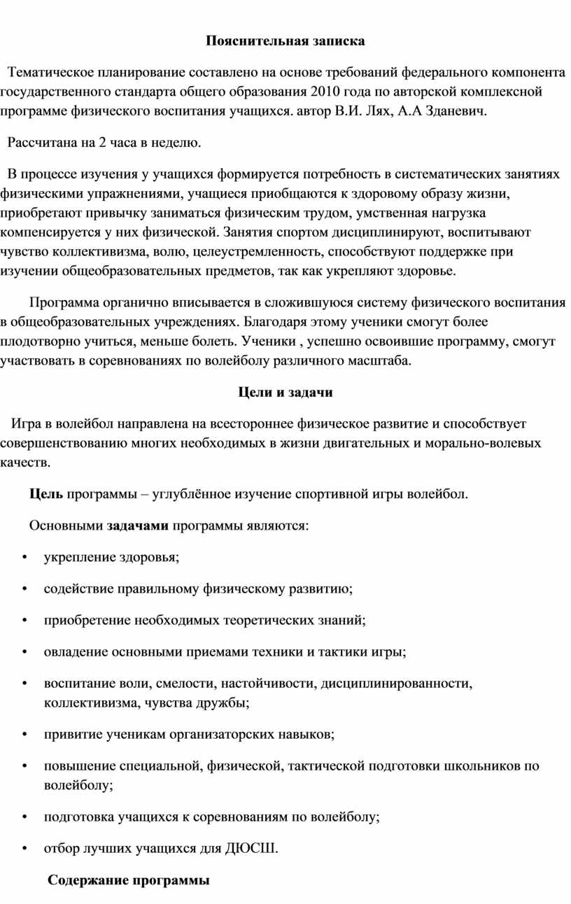 Тематическое планирование составлено на основе требований федерального компонента государственного стандарта общего образования 2010 года по авторской комплексной программе физического воспитания учащихся. автор В.И. Лях, А.А Зданевич.