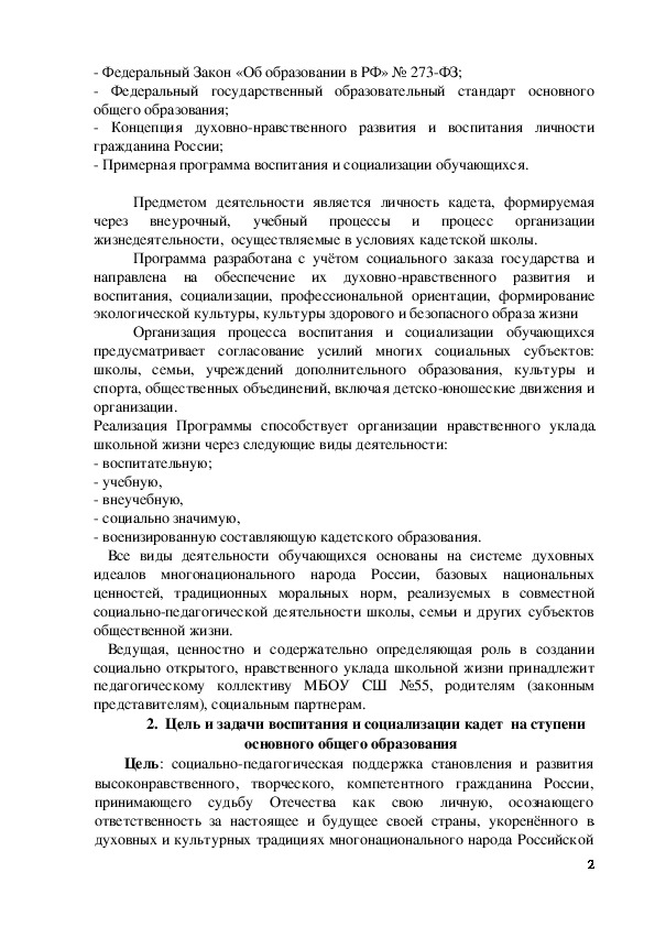 2. Цель и задачи воспитания и социализации кадет на ступени