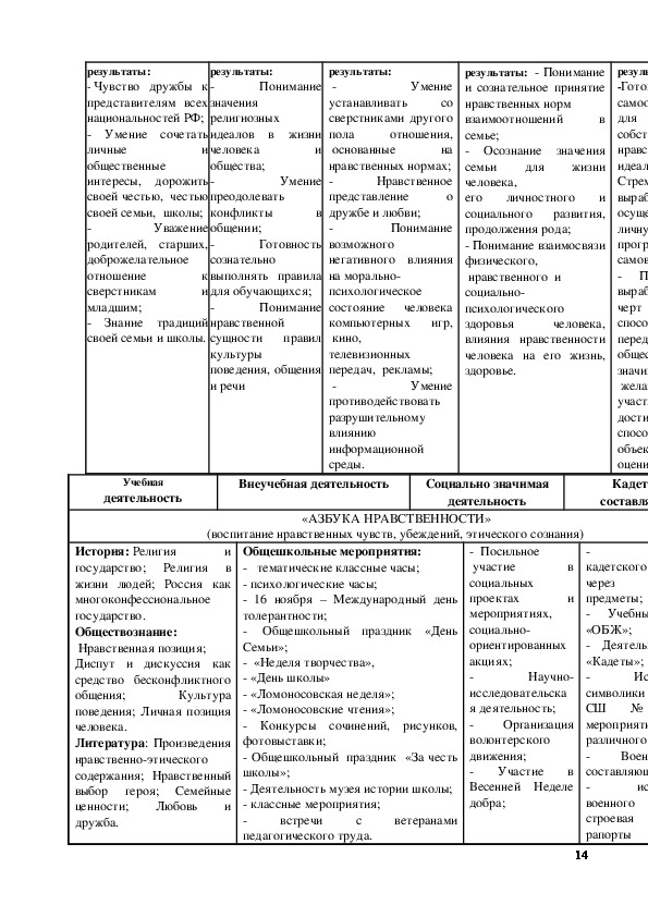 Все виды деятельности обучающихся основаны на системе духовных идеалов многонационального народа России, базовых национальных ценностей, традиционных моральных норм, реализуемых в совместной социально-педагогической деятельности школы, семьи и других субъектов общественной жизни.