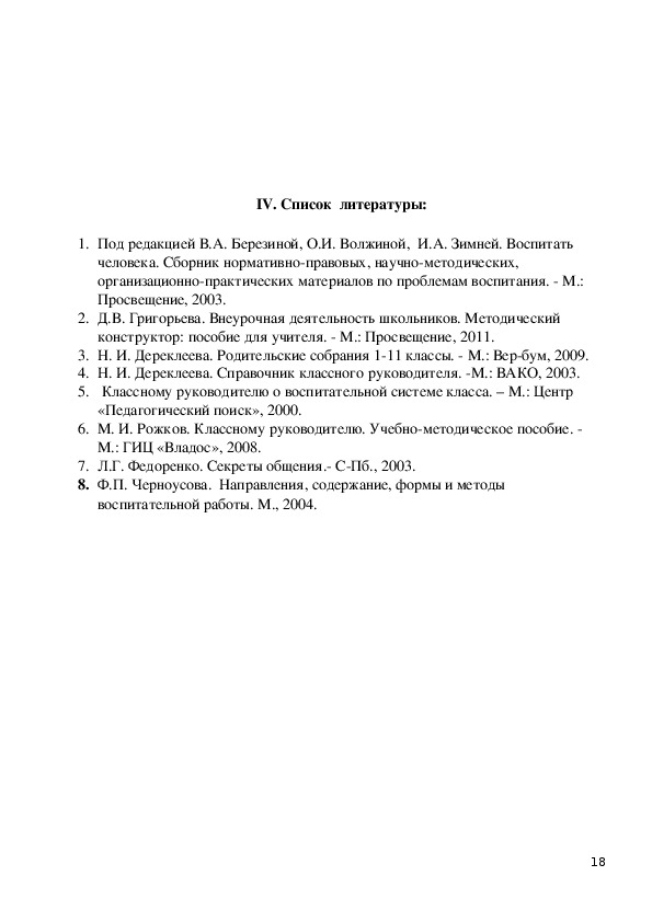 4. Н. И. Дереклеева. Справочник классного руководителя. М.: ВАКО, 2003.