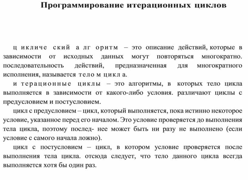 и терационные циклы – это алгоритмы, в которых тело цикла выполняется в зависимости от какого-либо условия. различают циклы с предусловием и постусловием.