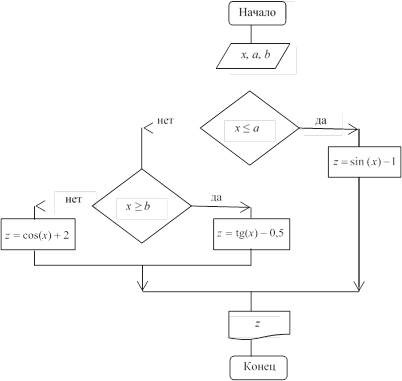 write('введите a='); readln(a); write('введите b='); readln(b); write('введите x='); readln(x); if x <= a then z: = sin(x) – 1