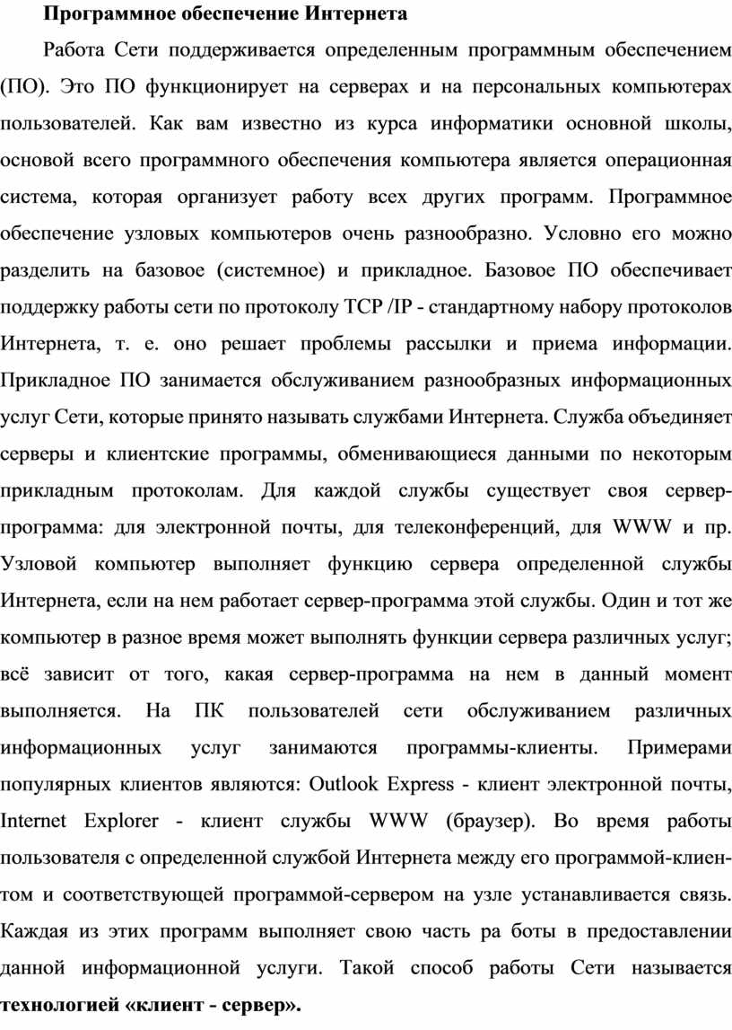 Работа Сети поддерживается определенным программным обеспечением (ПО). Это ПО функционирует на серверах и на персональных компьютерах пользователей. Как вам известно из курса информатики основной школы, основой всего программного обеспечения компьютера является операционная система, которая организует работу всех других программ. Программное обеспечение узловых компьютеров очень разнообразно. Условно его можно разделить на базовое (системное) и прикладное. Базовое ПО обеспечивает поддержку работы сети по протоколу ТСР /IP - стандартному набору протоколов Интернета, т. е. оно решает проблемы рассылки и приема информации. Прикладное ПО занимается обслуживанием разнообразных информационных услуг Сети, которые принято называть службами Интернета. Служба объединяет серверы и клиентские программы, обменивающиеся данными по некоторым прикладным протоколам. Для каждой службы существует своя сервер-программа: для электронной почты, для телеконференций, для WWW и пр. Узловой компьютер выполняет функцию сервера определенной службы Интернета, если на нем работает сервер-программа этой службы. Один и тот же компьютер в разное время может выполнять функции сервера различных услуг; всё зависит от того, какая сервер-программа на нем в данный момент выполняется. На ПК пользователей сети обслуживанием различных информационных услуг занимаются программы-клиенты. Примерами популярных клиентов являются: Outlook Express - клиент электронной почты, Internet Explorer - клиент службы WWW (браузер). Во время работы пользователя с определенной службой Интернета между его программой-клиентом и соответствующей программой-сервером на узле устанавливается связь. Каждая из этих программ выполняет свою часть ра боты в предоставлении данной информационной услуги. Такой способ работы Сети называется технологией «клиент - сервер».