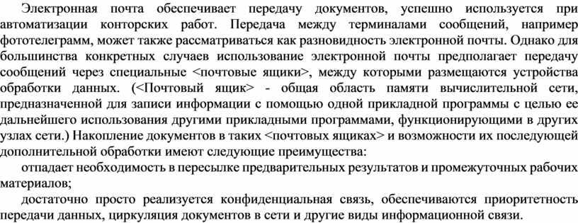 Электронная почта обеспечивает передачу документов, успешно используется при автоматизации конторских работ. Передача между терминалами сообщений, например фототелеграмм, может также рассматриваться как разновидность электронной почты. Однако для большинства конкретных случаев использование электронной почты предполагает передачу сообщений через специальные <почтовые ящики>, между которыми размещаются устройства обработки данных. (<Почтовый ящик> - общая область памяти вычислительной сети, предназначенной для записи информации с помощью одной прикладной программы с целью ее дальнейшего использования другими прикладными программами, функционирующими в других узлах сети.) Накопление документов в таких <почтовых ящиках> и возможности их последующей дополнительной обработки имеют следующие преимущества: