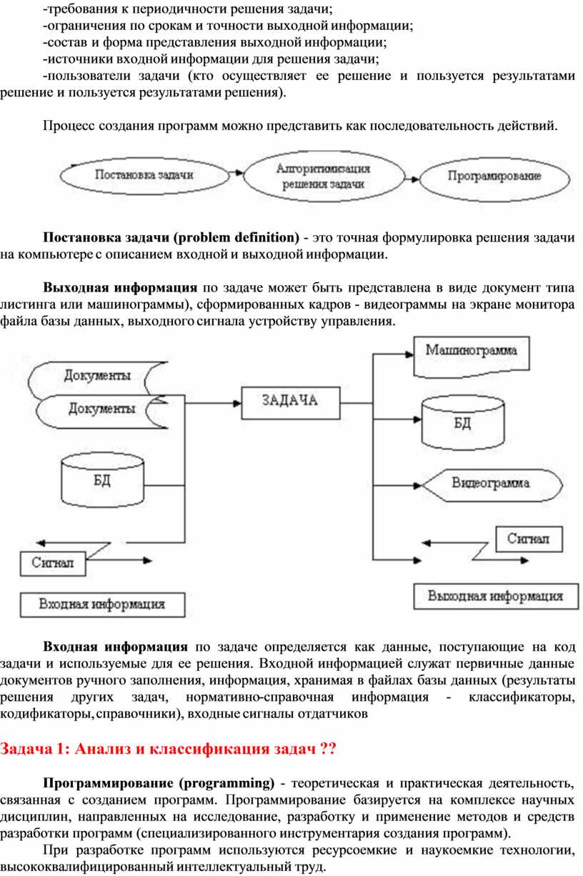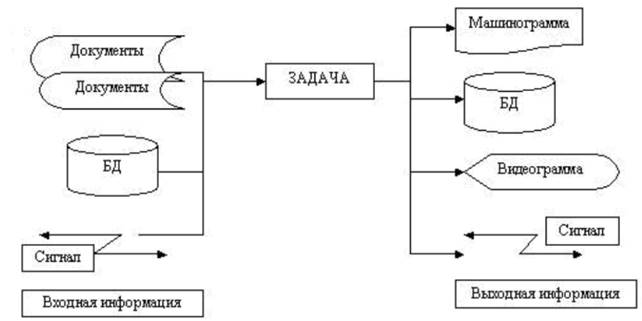 Выходная информация по задаче может быть представлена в виде документ типа листинга или машинограммы), сформированных кадров - видеограммы на экране монитора файла базы данных, выходного сигнала устройству управления.