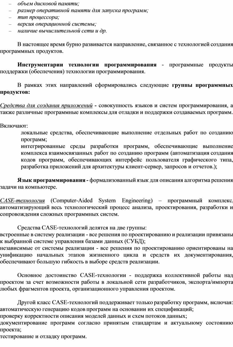 + интегрированные среды разработки программ, обеспечивающие выполнение комплекса взаимосвязанных работ по созданию программ (автоматизация создания кодов программ, обеспечивающих интерфейс пользователя графического типа, разработка приложений для архитектуры клиент-сервер, запросов и отчетов.);