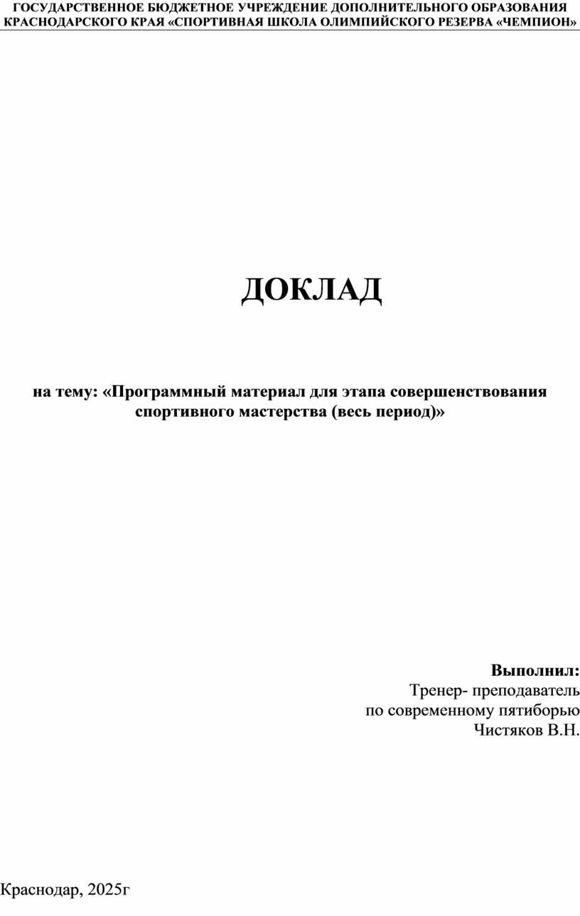 на тему: «Программный материал для этапа совершенствования спортивного мастерства (весь период)»