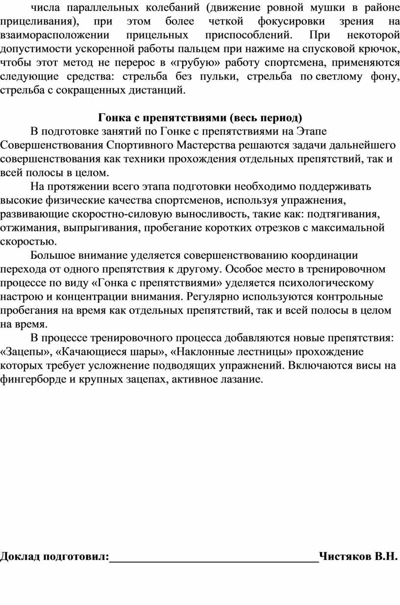 Подготовка в стрельбе на этапе совершенствования спортивного мастерства требует самого пристального внимания. При кажущейся простоте выполнения выстрела из пистолета в учебно-тренировочном процессе учитывается возможное расхождения между реальными способностями спортсмена и его собственной завышенной целевой установкой. Это явление может тормозить процесс дальнейшего совершенствования технических элементов.