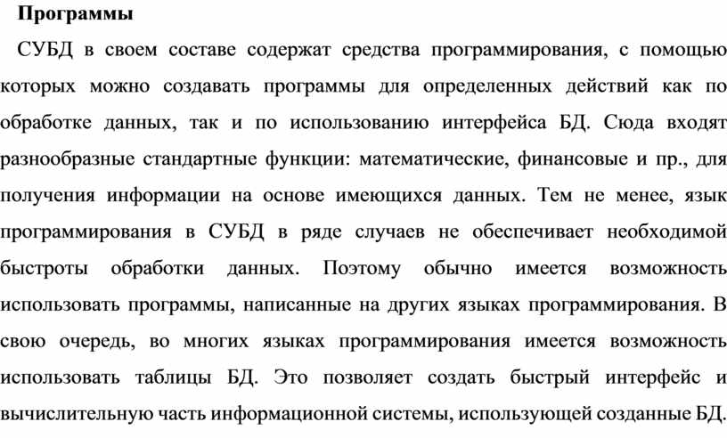 СУБД в своем составе содержат средства программирования, с помощью которых можно создавать программы для определенных действий как по обработке данных, так и по использованию интерфейса БД. Сюда входят разнообразные стандартные функции: математические, финансовые и пр., для получения информации на основе имеющихся данных. Тем не менее, язык программирования в СУБД в ряде случаев не обеспечивает необходимой быстроты обработки данных. Поэтому обычно имеется возможность использовать программы, написанные на других языках программирования. В свою очередь, во многих языках программирования имеется возможность использовать таблицы БД. Это позволяет создать быстрый интерфейс и вычислительную часть информационной системы, использующей созданные БД.