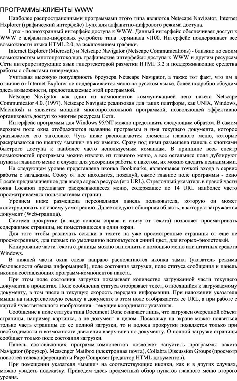 Наиболее распространенными программами этого типа являются Netscape Navigator, Internet Hxplorer (графический интерфейс) Lynx для алфавитно-цифрового режима доступа.
